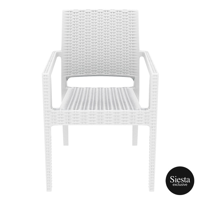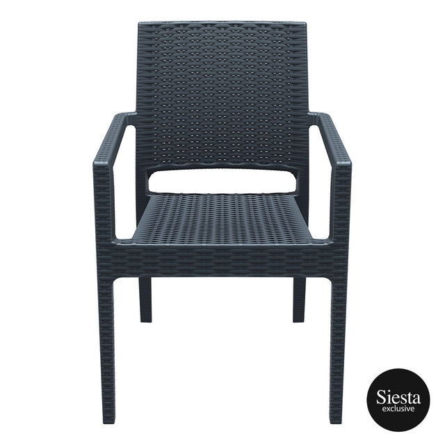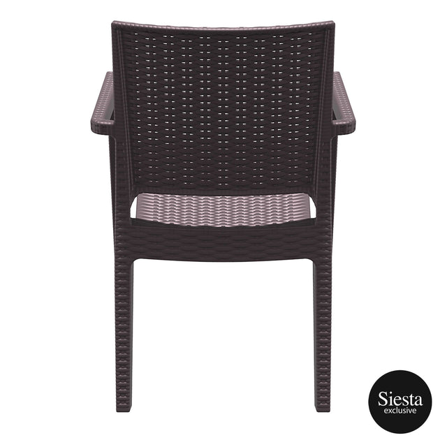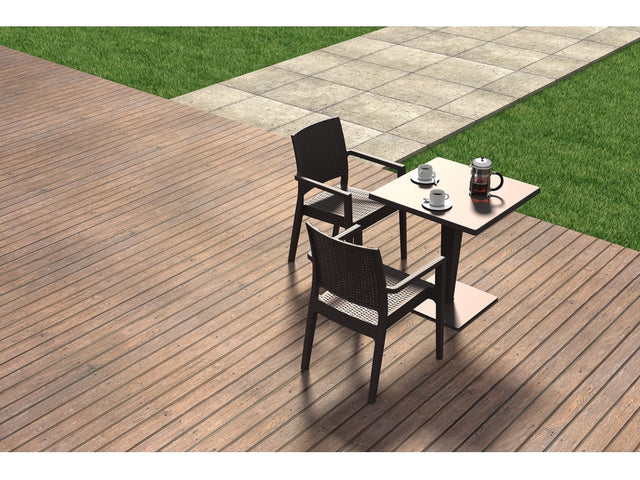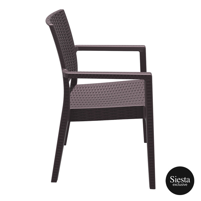 The Ibiza Arm chair is an injection moulded resin chair, the non-metalic frame will never unravel, rust or decay, with rattan look seat and back. Reinforced with glass fibre to strengthen the legs and boost the weight capacity. The Ibiza Armchair is stackable, designed for outdoor use, UV stable and weather proof, it will not fade or go brittle in Australia’s harsh outdoor conditions. Strong yet lightweight, this chair will add class to your venue. It’s sleek profile is pleasant to the eye so this chair is as charming as it is functional. Very easy to clean, just hose it down.