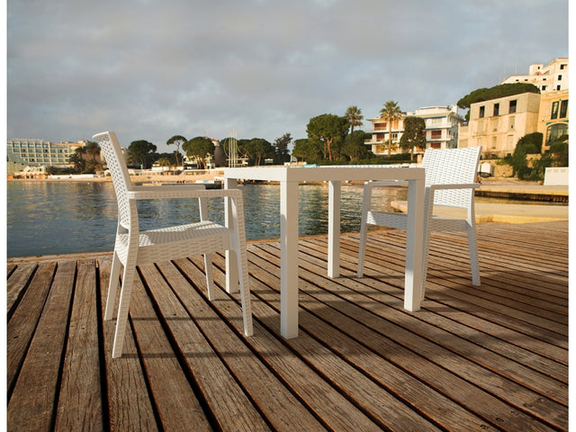 The Orlando Table is an injection moulded resin table, the non-metalic frame will never unravel, rust or decay, with rattan edges it matches the rattan chairs. Reinforced with glass fibre to strengthen the legs and boost the weight capacity. Strong yet lightweight, this table will add class to your venue. It’s sleek profile is pleasant to the eye so this table is as charming as it is functional. Very easy to clean, just hose it down.