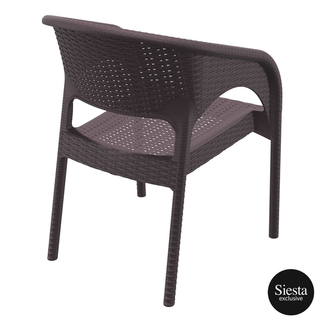 The Panama Armchair is an injection moulded resin chair, the non-metalic frame will never unravel, rust or decay, with rattan look seat and back. Reinforced with glass fibre to strengthen the legs and boost the weight capacity. The Panama Armchair is stackable, designed for outdoor use, UV stable and weather proof, it will not fade or go brittle in Australia’s harsh outdoor conditions. Strong yet lightweight, this chair will add class to your venue. It’s sleek profile is pleasant to the eye so this chair is as charming as it is functional. Very easy to clean, just hose it down.