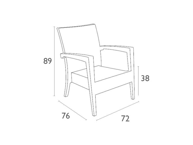 The Tequila Lounge Armchair is an injection moulded resin chair, the non-metalic frame will never unravel, rust or decay, with rattan look seat and back. Reinforced with glass fibre to strengthen the legs and boost the weight capacity. The Tequila Lounge Armchair is stackable, designed for outdoor use, UV stable and weather proof, it will not fade or go brittle in Australia’s harsh outdoor conditions. Strong yet lightweight, this chair will add class to your venue. It’s sleek profile is pleasant to the eye so this chair is as charming as it is functional. Very easy to clean, just hose it down.